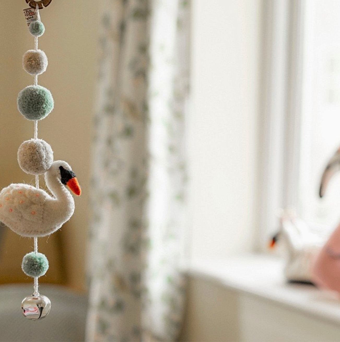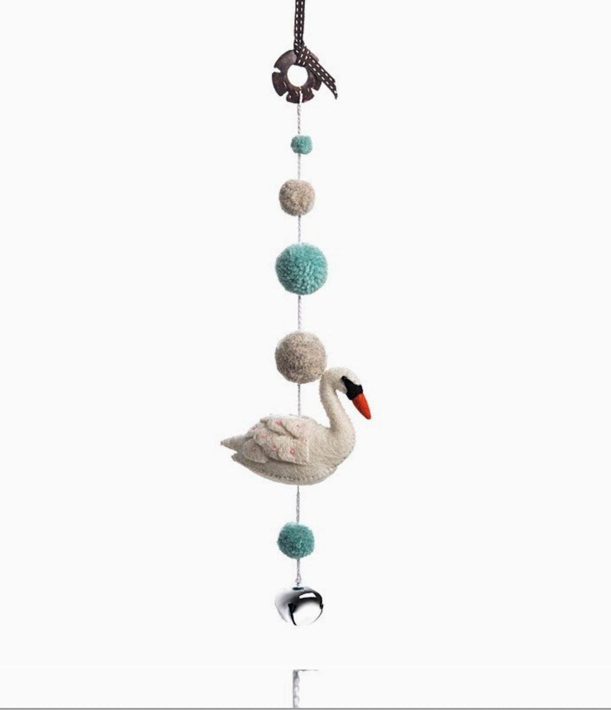 Magnifique décoration de chambre d'enfant composée de pompons en laine, de feutre organique, d'une cloche en argent, d'un cordon et d'un anneau de suspension en bois.
