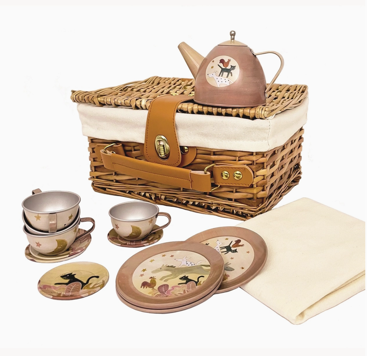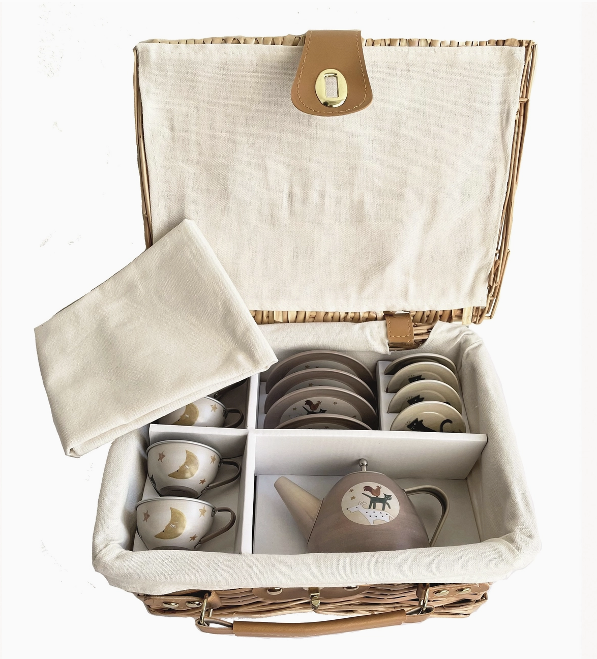 Comprend 4 tasses et soucoupes, 4 assiettes, une théière en étain et un torchon, dans un adorable coffret en osier.