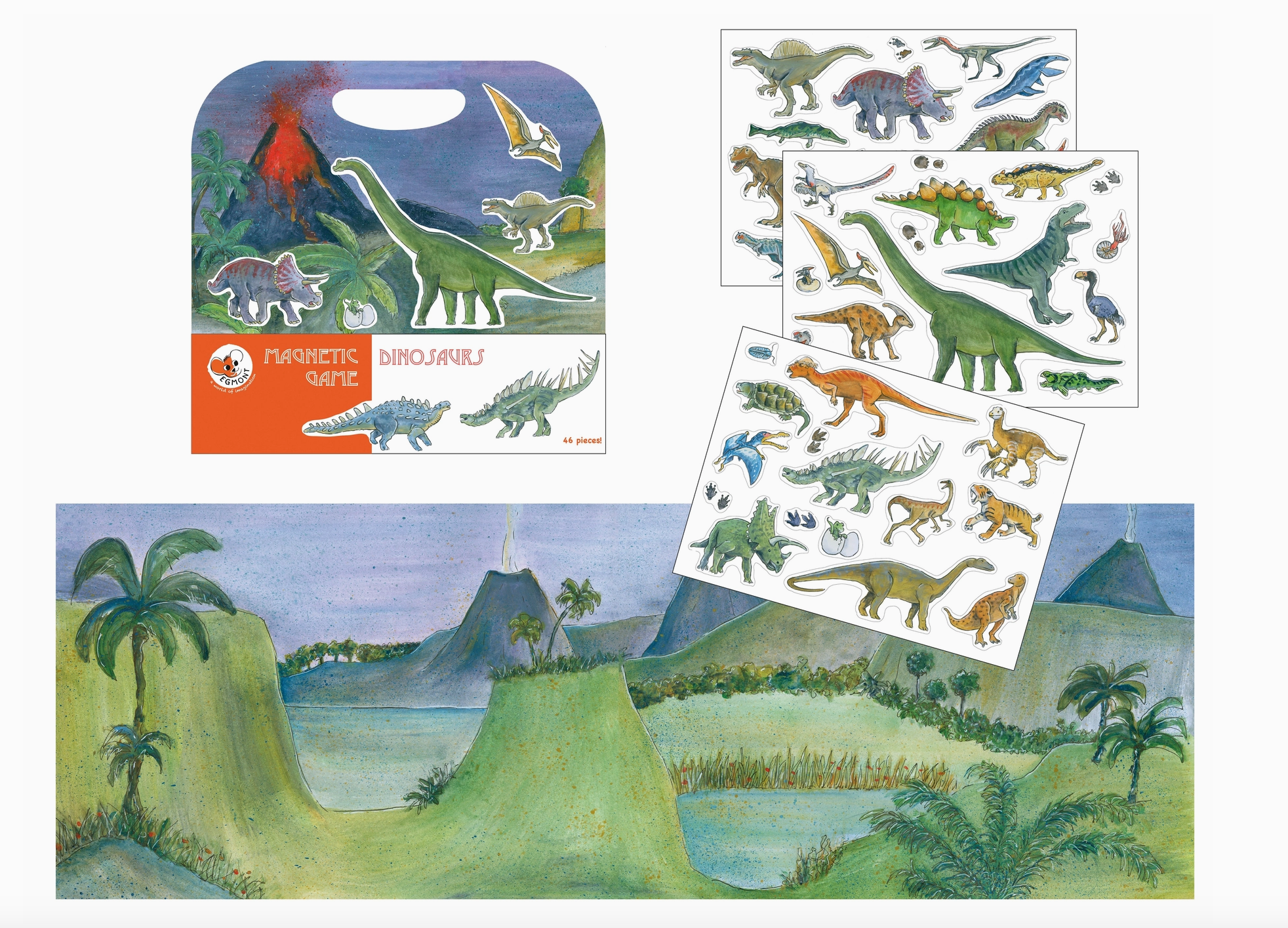 Le jeu d'activité magnétique s'ouvre pour montrer la terre où erraient les dinosaures. Créez une histoire en remplissant cette terre de toutes sortes de dinosaures ! T-rex, brachiosaure, tricératops, stégosaure et plus encore !
