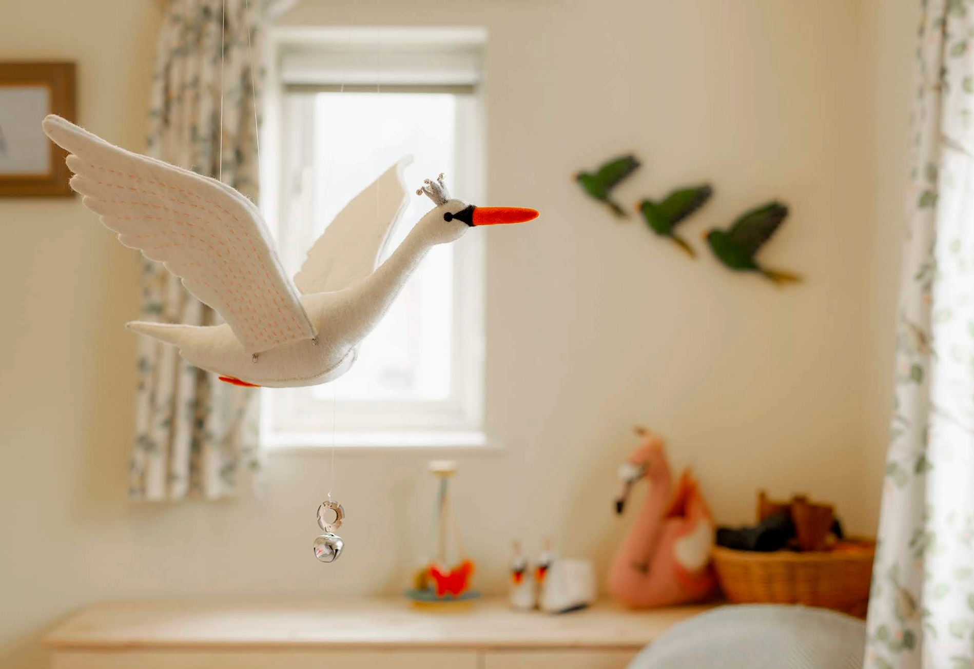 Odette le Cygne a pris son envol avec notre serein Mobile Cygne - Battant Tirez simplement sur la clochette argentée pour faire battre ses ailes, elle ravira les petits et les grands de cœur !